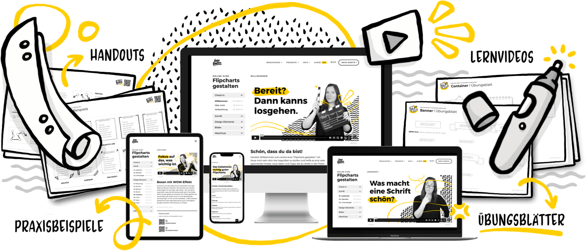 Here you can get an impression of the content and structure of the course. The course consists of a total of 20 videos with a running time of around two hours as well as plenty of exercise sheets and opportunities to join in and try things out. The content is divided into __four modules__. Each module takes about an hour. Allow about 30 minutes for the theory (learning videos) and another 30 minutes for the exercises, where you can put what you have learned into practice and consolidate it. The more you try things out yourself, the more progress you will make. The time given for the exercises is therefore only a rough guide. In addition to the exercises in each module, you will also find numerous practical examples in the course with step-by-step drawing instructions including tips for use in the seminar. So you can take four hours in one morning or evening and do all the modules one after the other. Or, you can divide up the modules over a longer period of time and do them in separate blocks and, for example, take an hour every Friday ("Flipchart Friday" is easy to remember) afternoon to take your flipcharts a step further.